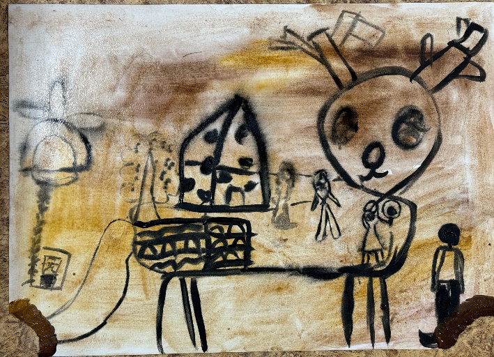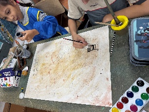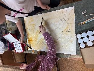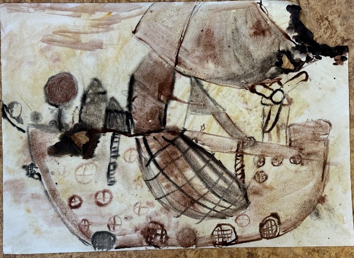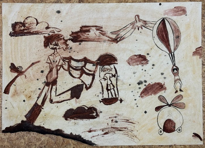 - «состарить» бумагу (жидким замесом коричневого цвета тонируем бумагу, добавляем набрызги более темной краской. для эффекта горелого края, прокрашиваем края замесом черного и коричневого цвета. ;