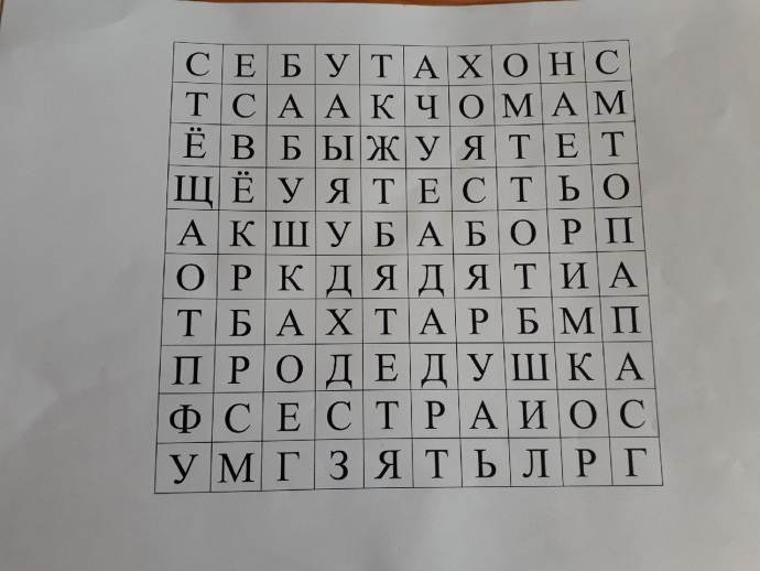 Написаны буквы по горизонтали и вертикали. Нужно найти слова, обозначающие членов семьи, ваших родственников. Слова могут располагаться в сетке квадрата как слева направо, сверху вниз, так и в обратном порядке. Слова не могут располагаться по ломаным линиям.