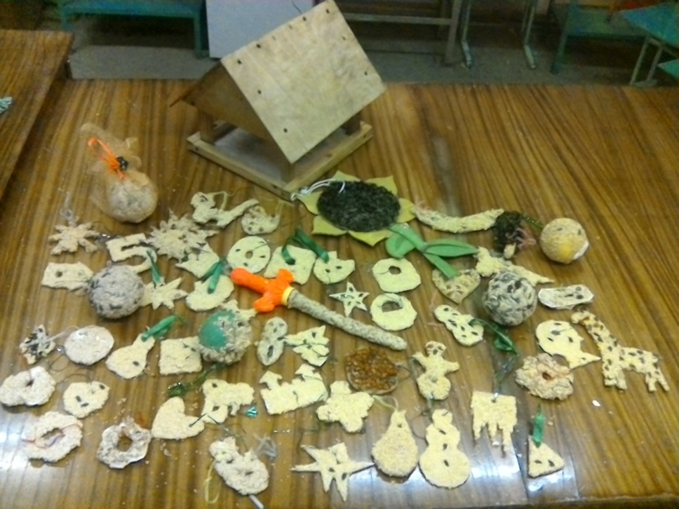 Ребята придумывают и вырезают из картона небольшие фигурки произвольной формы, либо делают поделку с использованием съедобных для птиц продуктов