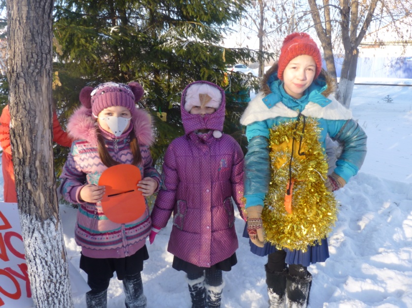 Флешмоб состоялся 15 декабря 2015г. Общее число задействованных учащихся 32 человека. Смогло принять участие 15 декабря – 17 человек, в связи с учёбой во время проведения флешмоба. Съедобными игрушками для птиц ребята украсили ель на пришкольной территории, а нарисованные плакаты установили на хорошо обозримом участке, у школы.