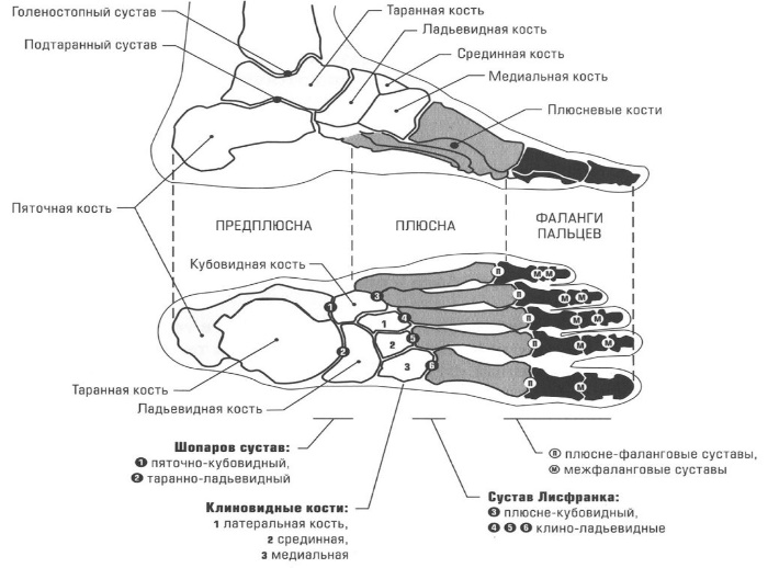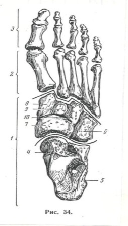 Предплюсна состоит из 7 костей: таранной (4), пяточной (5), кубовидной (6), ладьевидной (7), трёх клиновидных костей (8, 9, 10).Плюсна состоит из 5 плюсневых костей.Все пальцы, кроме большого, имеют по три фаланги, большой – две.