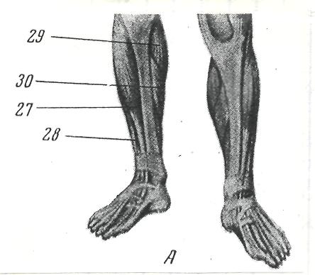 1. Передняя большеберцовая мышца (27 на рис. 3) разгибает стопу свободной ноги. На опорной ноге сгибает голень, приближая её к тылу стопы (в plie).