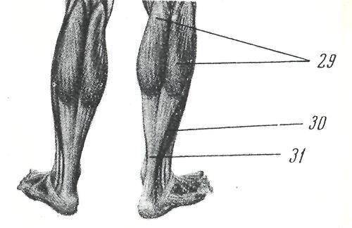 Икроножная (29 на рис.3) и камбаловидная (30 на рис. 3) мышцы образуют трёхглавую мышцу голени. Они крепятся ахилловым сухожилием (31 на рис. 3, 2 на рис. 4 и 14 на рис. 5) к пяточному бугру. Эта мышца хорошо развита. Она удерживает тело от падения вперёд, сгибает стопу, переводит её с пятки на носок при ходьбе. В хореографии по ней хорошо определяется дотянутость стопы.