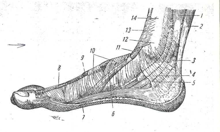 1 – длинный сгибатель пальцев, 2 – ахиллово сухожилие, 3 – влагалище сухожилия длинного сгибателя I пальца, 4 – влагалище сухожилия задней большеберцовой мышцы, 5 – влагалище сухожилия длинного сгибателя пальцев, 6 – сухожилие передней большеберцовой мышцы, 7 – отводящая мышца I пальца, 8 – сухожилие длинного разгибателя I пальца, 9 – влагалище его сухожилия, 10 – крестообразная связка, 11 – влагалище сухожилия передней большеберцовой мышцы, 12 – медиальный мыщелок, 13 – поперечная связка, 14 – большеберцовая кость.
