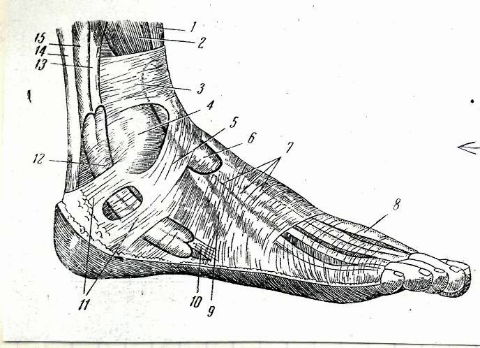 1 – длинный разгибатель I пальца, 2 – длинный разгибатель пальцев, 3 – поперечная связка, 4 – латеральная лодыжка, 5 – крестообразная связка, 6 – влагалище сухожилия длинного разгибателя пальцев, 7 – сухожилия этой мышцы под фасцией, 8 – сухожилие длинного разгибателяI пальца, 9 – сухожилие третьей малоберцовой мышцы, 11 – связки, удерживающие сухожилия малоберцовых мышц, 12 – влагалище для этих сухожилий, 13 – короткая малоберцовая мышца, 14 – ахиллово сухожилие, 15 – длинная малоберцовая мышца