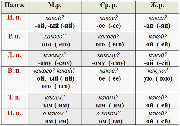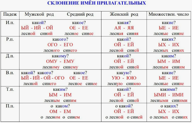 Имена прилагательные, как и имена существительные, изменяются по падежам, или склоняются. Имя прилагательное всегда стоит в том же роде (в единственном числе), числе и падеже, что и имя существительное, с которым имя прилагательное связано по смыслу. |