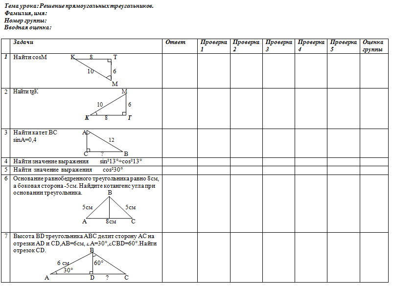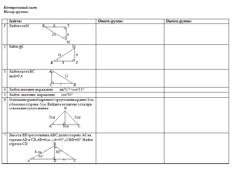 Пример 3. приём самопроверки, приём взаимоконтроля. Урок в 7-ом классе. Тема урока: Треугольники. Признаки равенства треугольников. Тип урока : урок систематизации и обобщения.Цель урока: развивать умение оперировать понятиями, владеть компонентами доказательства, умение высказывать оценочные суждения по заданным критериям, умение находить ошибки в информации и исправлять её, умение выслушивать мысли других, умение сотрудничать с окружающими и получать знания путем коллективной деятельности. В начале урока учащиеся совместно с учителем определяют цели и задачи урока. В ходе урока учащиеся работают в группах по 4 человека. Каждая группа получает задачу на доказательство. Время выполнение задания 5-10 мин. Группы рассказывают по очереди свое доказательство. Класс в это время внимательно слушает и готовится дать рецензию решению задачи и ответу группы использую критерии ответа у доски и доказательства задачи.