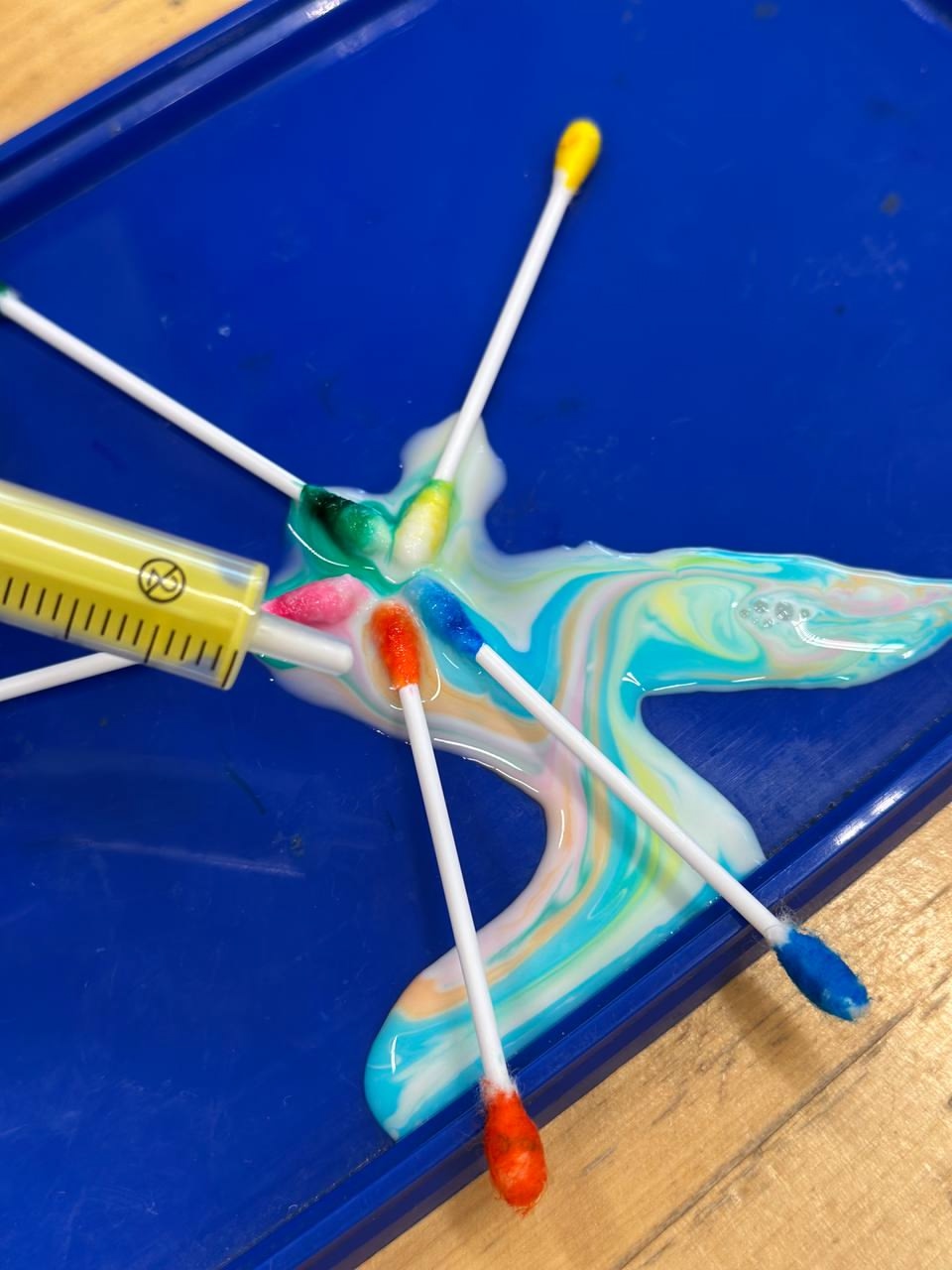 Выкладываем ватные палочки в форме солнца и с помощью шприца вводим на цветную часть;