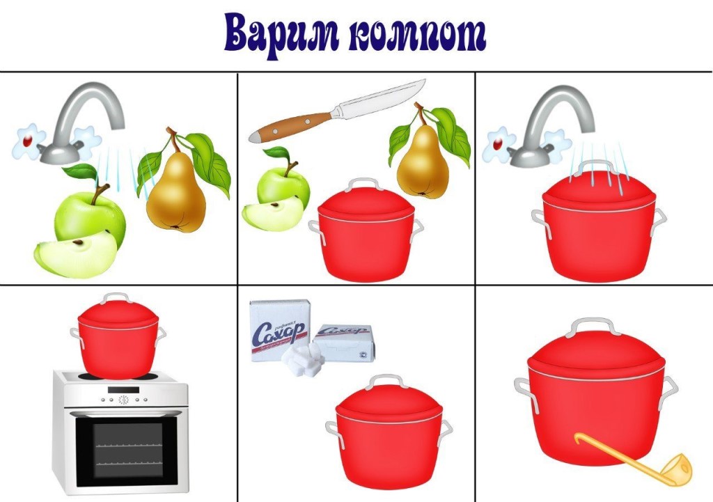 Молодцы, ребята. Но чтобы стать настоящими поварами, знать посуду мало. Что должен уметь делать повар? (готовить).Верно!Посмотрите на вот эту картинку, что вы видите? (Воспитатель показывает схему приготовления компота)