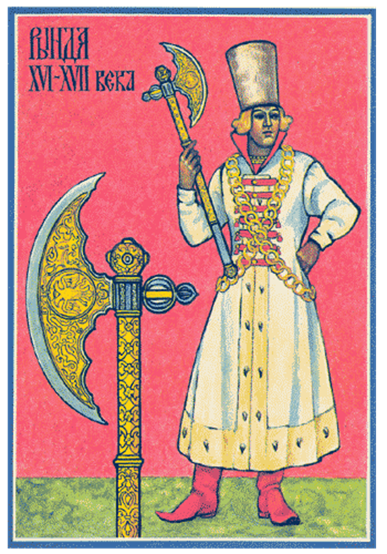 В XVI-XVII веках при великих князьях и царях находились оруженосцы-телохранители (рынды), которые сопровождали монарха в походах и поездках, а во время дворцовых церемоний стояли в парадных одеждах по обе стороны трона. Когда рынды несли свою службу во дворце, их вооружение составлял большой "посольский топор" (непременный атрибут аудиенций, которые московские государи давали иностранным послам; отсюда происходит и название топора). Он делался из булата и стали, декорировался серебряной и золотой насечкой. Рукояти этих топоров украшали поясками из драгоценных металлов (иногда, впрочем, обходились золоченой медью), часто покрывали инкрустацией.