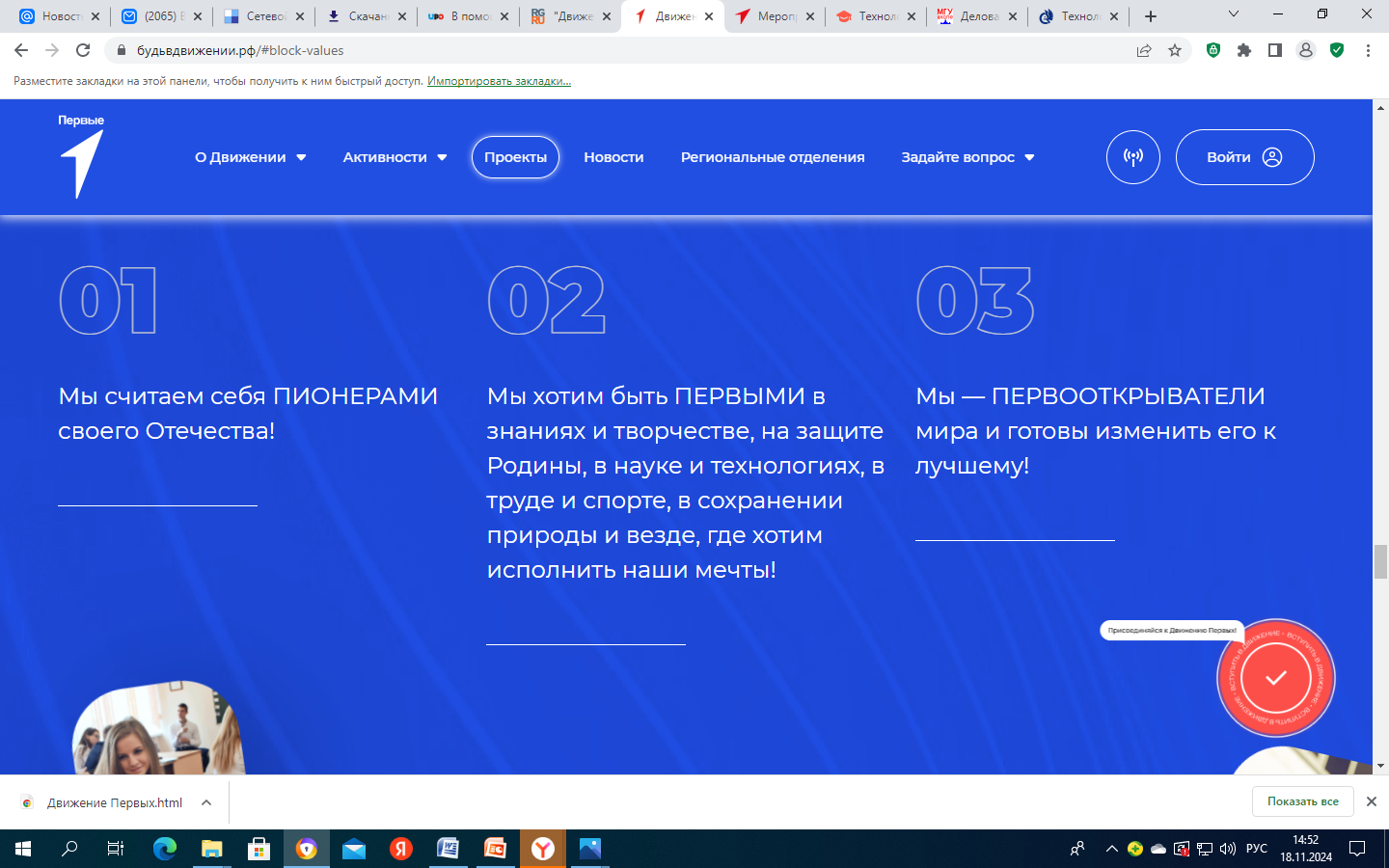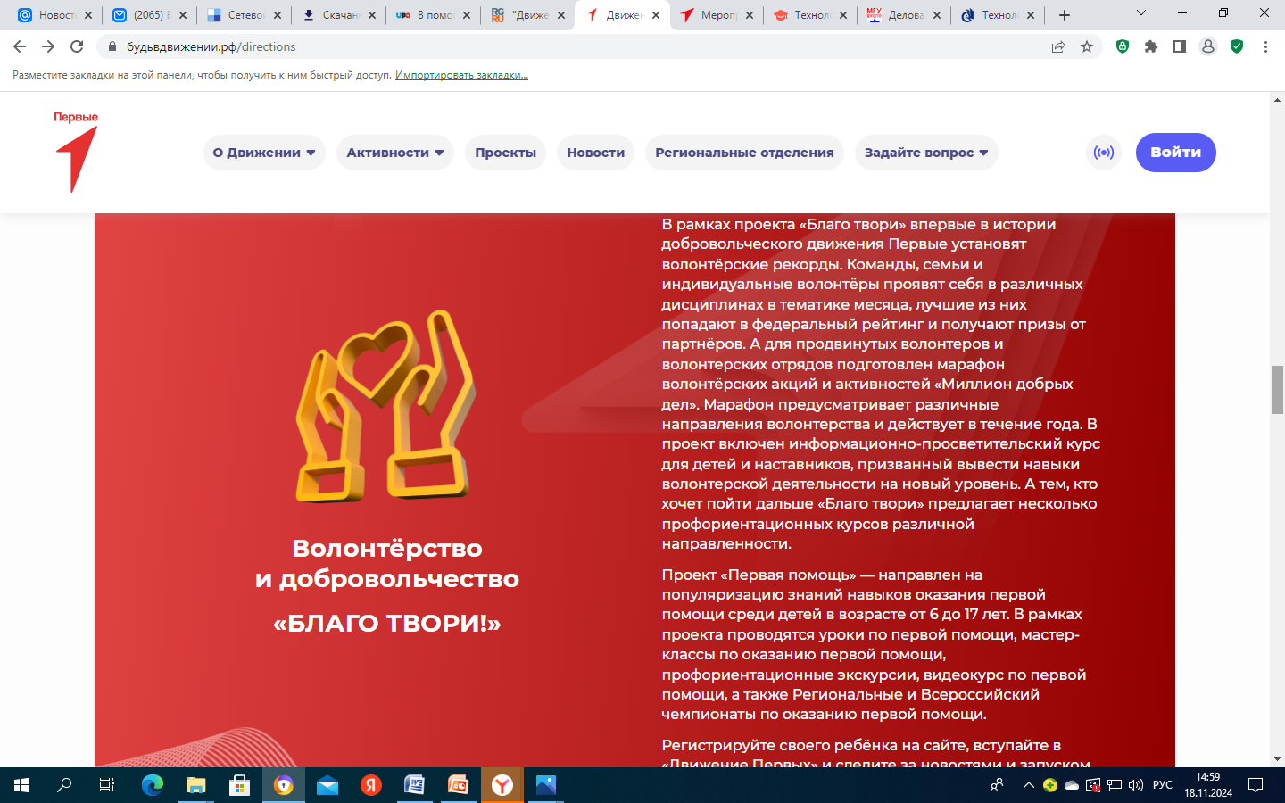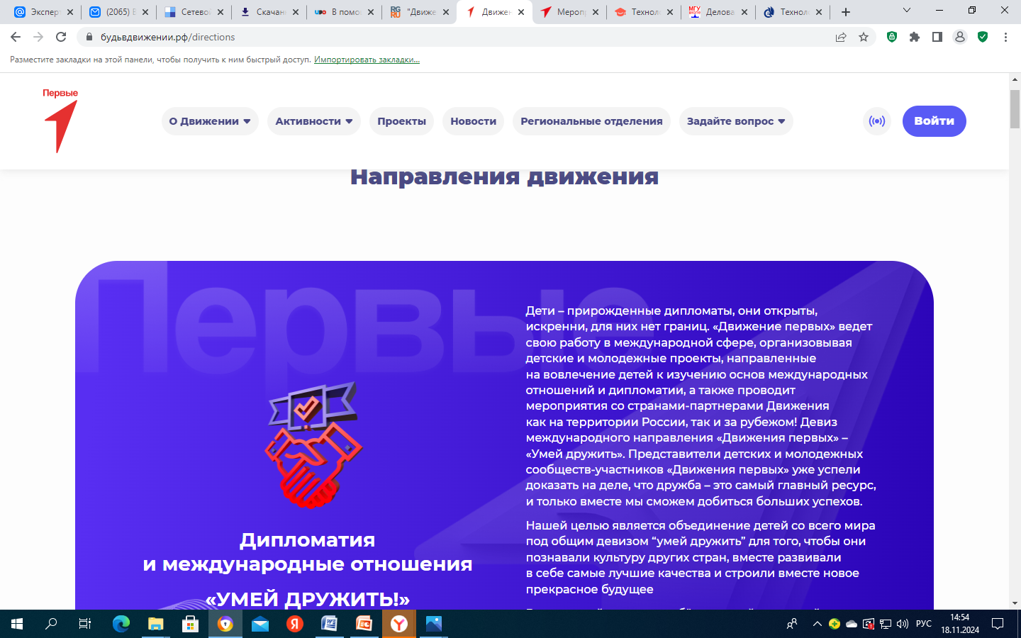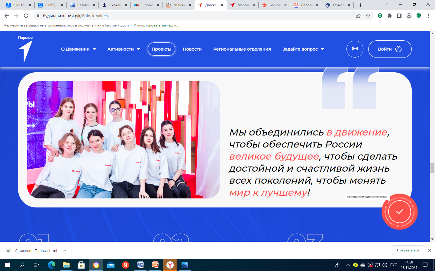 С 2022 года в нашей стране существует Движение “Первых” – это общественная организация, которая помогает развивать лидерские качества и социальные навыки у детей и молодёжи, по средством приобщения их к участию в различных проектах и инициативах.