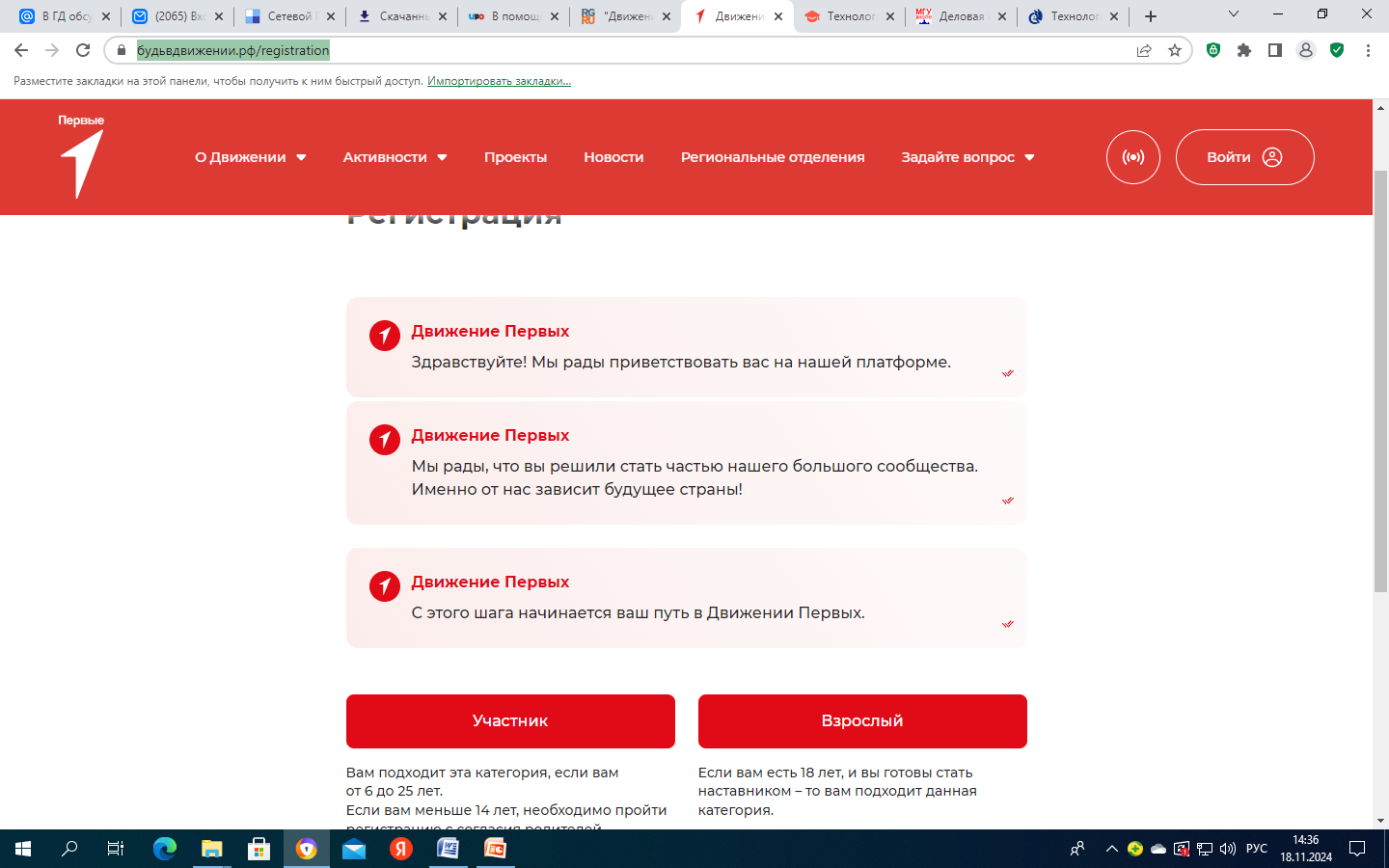 Вступление - добровольное. Возраст участников движения - от 6 до 18 лет. Чтобы стать членом организации, нужно просто присоединиться к движению. Для этого необходимо зайти на сайтhttps://xn--90acagbhgpca7c8c7f.xn--p1ai/registration, пройти по ссылке "Вступить в движение" и зарегистрироваться. Есть два варианта регистрации: как ребёнок и как взрослый (наставник).