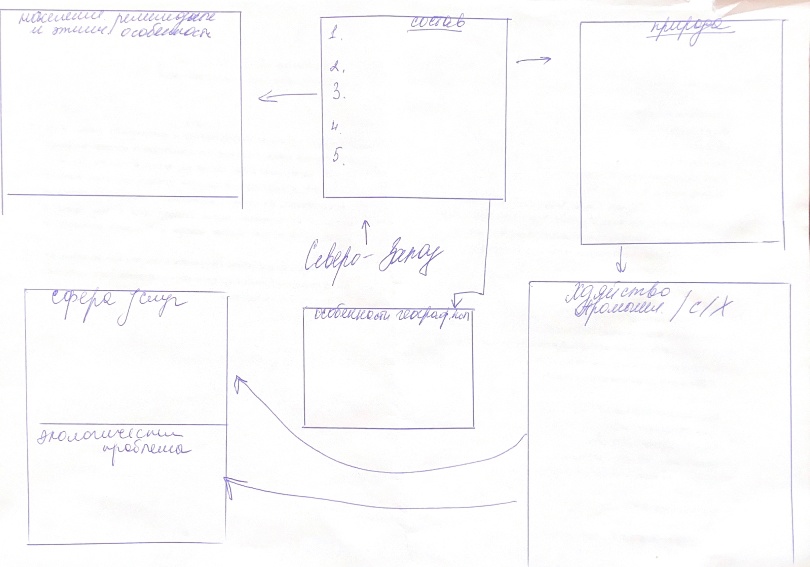 Как показывает мой опыт работы со скрайбинг-технологией, лучше всего и интереснее детям, этот вид работы пришелся на экономические районы страны. К этому разделу ученики уже научились выполнять скрайбинг, поэтому уже можно усложнять задачу. Но для начала ученики, опять же, вместе с учителем выполняют по ходу урока скрайбинг «Северо-Западный экономический район». Учитель на доске, ученики в тетради, выполняют визуализацию информации по теме. Здесь можно предложить ученикам самим подготовить скрайб, а потом по одному выходить к доске и дописывать информационные блоки. Либо учитель на доске рисует «немой» скрайб (рисунок 4), а задача учащихся его заполнить. Такой вид работы подойдет на таких этапах урока как актуализация знаний, проверка домашнего задания и первичное закрепление знаний.