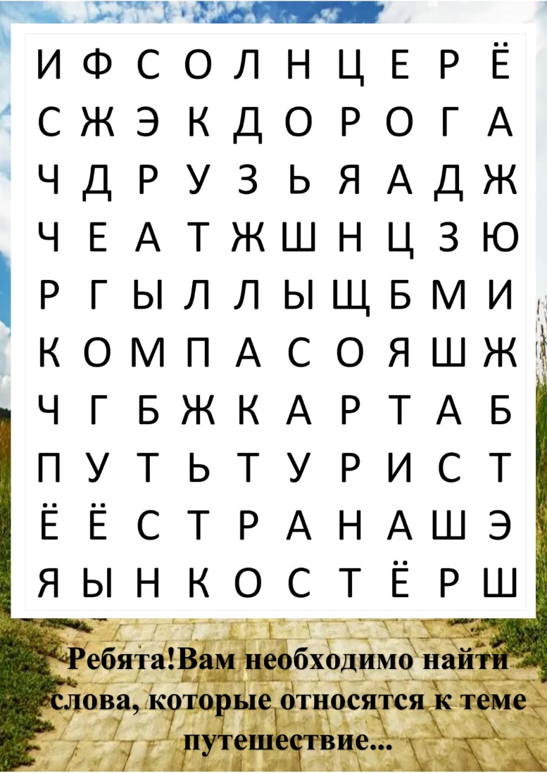 Ответы: солнце, дорога, друзья, компас, карта, путь, турист, страна, костёр