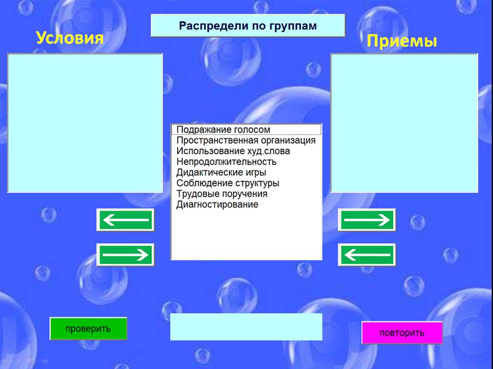 Чтобы выполнить перечисленные задачи, мы должны создать условия для исследовательской деятельности детей и использовать приемы для ее организации. Какие именно, я предлагаю сейчас вместе с вами распределить. Приемы – подражание голосом, художественное слово, дидактические игры, трудовые поручения. Остальные – это условия.