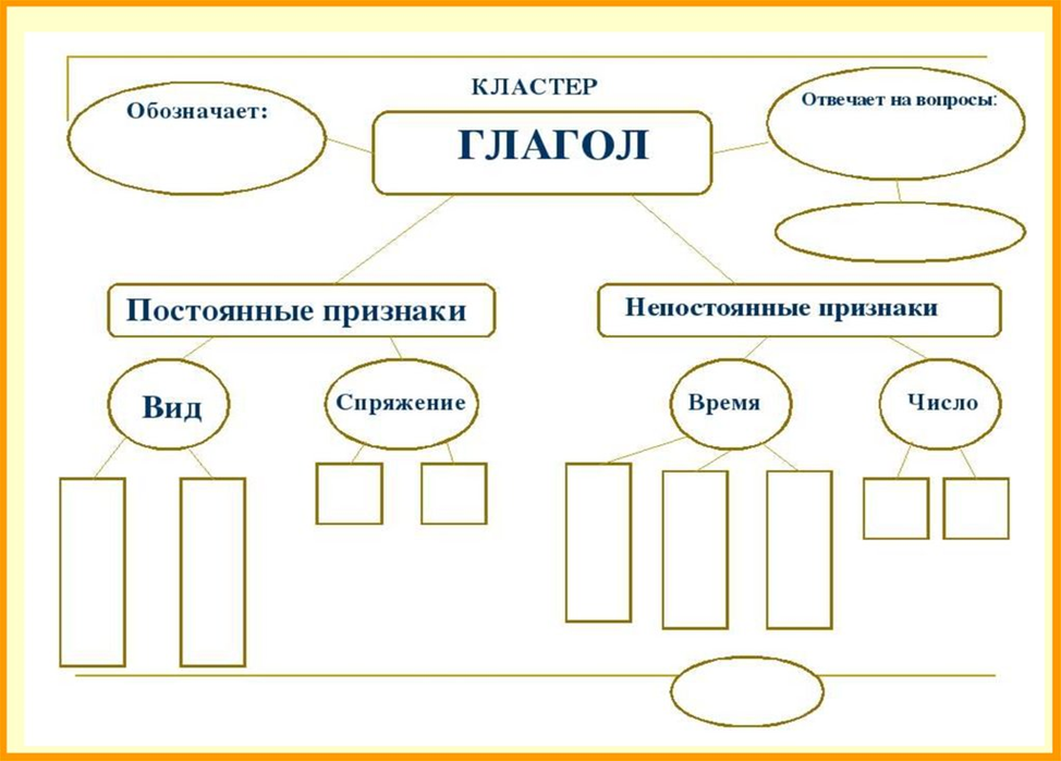 4. Первичное закрепление - в знакомой ситуации (типовые); - в именной ситуации (конструктивные). | Итак, мы начинаем быстро двигаться по пути в страну Глагола. Задание 3. Составим кластер. (карточка 2)(Повторенье – мать ученья) (слайд 13) Первый постоянный признак - вид. Как можно определить вид глагола? - Учитель: Итак, первый вид совершенный. На какой вопрос он отвечает? На какой вопрос он отвечает глагол несовершенного вида? Делаем вывод и вспоминает стихотворение о видах глагола. Второй признак – это спряжение. Что такое спряжение? Как определить спряжение глагола? Непостоянные признаки.