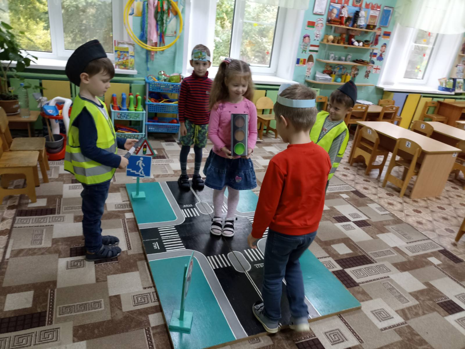Дети в игровой форме знакомятся с такими понятиями как: светофор, дорожные знаки, пешеход, водитель.