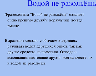Попугай Кеша предлагает нам следующее задание. А именно - познакомиться с новым фразеологическим оборотом. Водой не разольешь. Друзья не разлей вода.