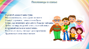 Р | Показ презентации «Моя семья». Слайд 7 «Семейный паровозик» Педагог предлагает воспитанникам рассадить членов семьи в каждый вагон по старшинству. Показ презентации «Моя семья». Слайд 8 «Пословицы» Педагог предлагает детям рассказать домовенку значения пословиц о семье. Ну а сейчас, чтобы глазки отдохнули, сделаем зарядку для снятие зрительного напряжения. Глазки влево, глазки вправо, Вверх и вниз, и все сначала. Быстро, быстро поморгай – Отдых глазкам своим дай! Чтобы зоркими нам быть – Нужно глазками крутить. Зорче глазки чтоб глядели, разотрем их еле-еле. | Дошкольники выполняют задание. Воспитанники с педагогом обсуждают значение пословиц. Дети выполняют движения глазами медленно, не поворачивая головы, в соответствии с текстом. Массировать верхние и нижние веки, не закрывая глаз. |