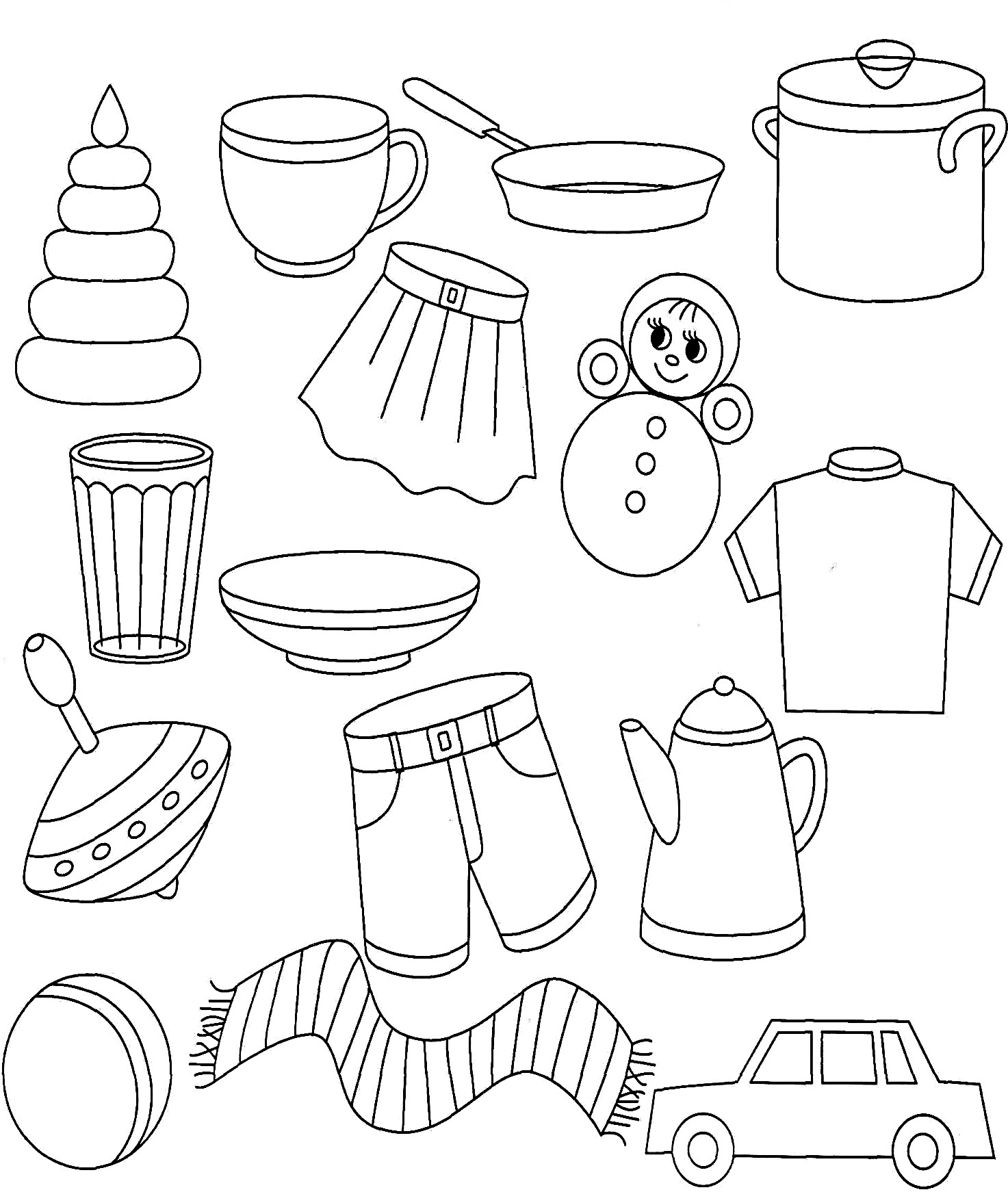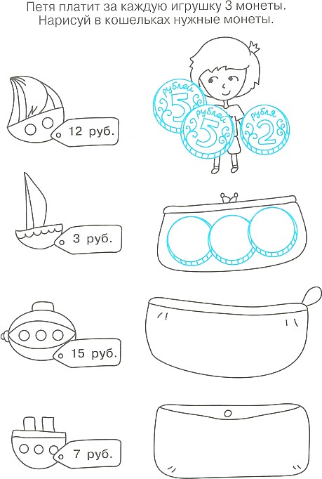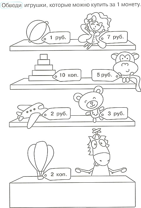 Назови все игрушки, которые можно купить за 2 рубля, 1 рубль, 5рублей.Раскрасьигрушки–синимцветом,посуду–краснымцветом,аодежду–желтымцветом.