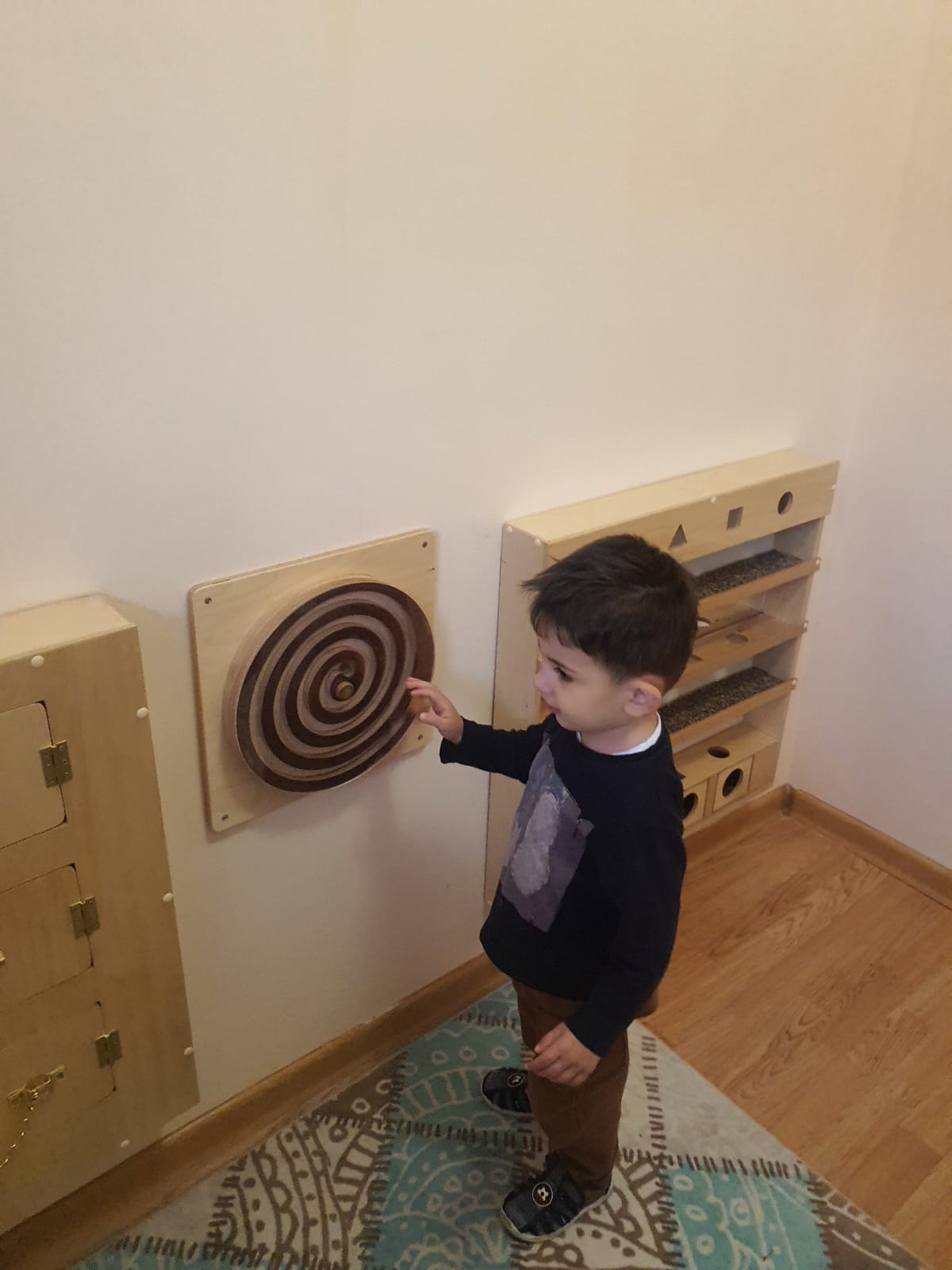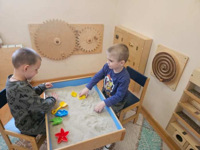На базе учреждения создана игровая комната, которая оборудована модулями Монтессори (настенный модуль «Зубчатые колеса», настенный модуль с 6 – ю замочками и задвижками, настенный модуль с объемными телами и зеркалом, настенный лабиринт «Спираль»). Игровой материал не только способствует сенсорному развитию ребенка, но и помогает психологу наблюдать за самостоятельной деятельностью ребенка. Стол - песочница и сухой душ помогает снятию эмоционального напряжения.