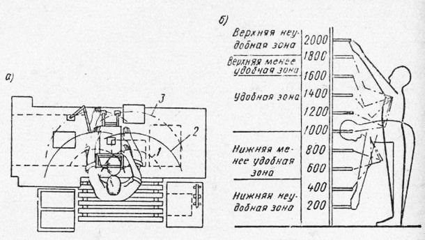 На рабочем месте должны находиться только те предметы, которые необходимы для выполнения данного задания. Предметы, которыми рабочий пользуется чаще, кладут ближе, в зоне досягаемости рук, ограниченной в горизонтальной плоскости дугами 1 (рис. 1,а). Максимальная зона досягаемости составляет примерно 500 мм (она ограничивается дугами 2) и 600 мм с наклоном не более чем на 30° для работающего среднего роста — дугами 3 (см. рис. 1 ,а).