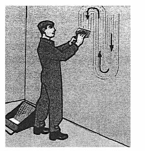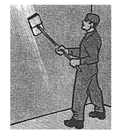 Закончив шлифовку, маляр наливает в ведро грунтовку, подносит его к рабочему месту и при помощи кисти макловицы огрунтовывает отшлифованные места движениями сверху вниз, как показано на рисунке . При необходимости работу вести со столика.
