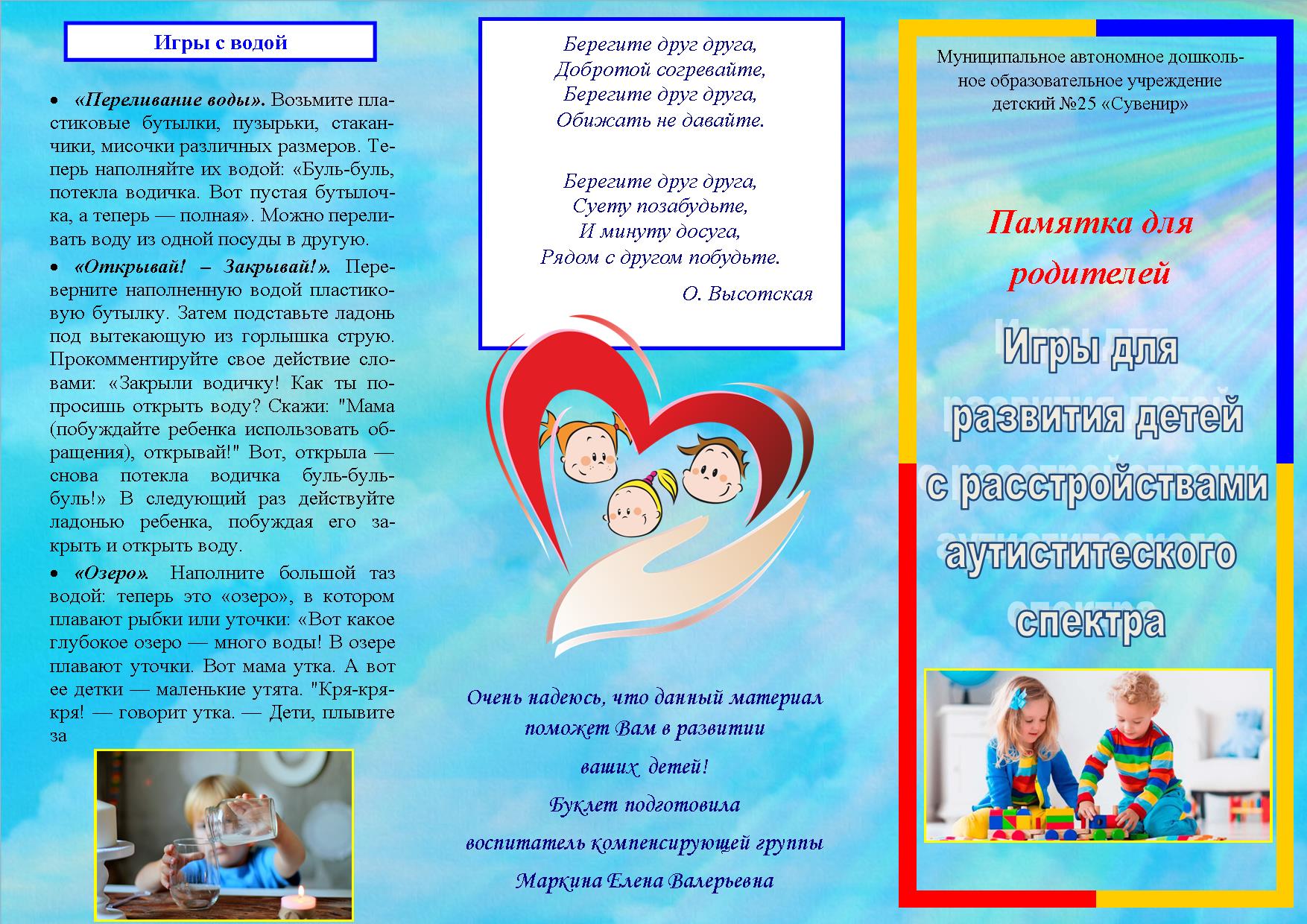 10.05.2021 Памятка для родителей "Игры для развития детей с расстройствами аутистического спектра" Принять участие в этом конкурсе Описание конкурса Список всех конкурсов Маркина Елена Валерьевна МАДОУ детский сад №25 г. Павлово Конкурсная работа Свидетельство участника экспертного совета жюри Свидетельство можно заказать сразу, как Вы оставите не менее 3 объективных комментариев в этом разделе сайта. Узнать подробнее Методическая разработка конкурсного задания для детей с ОВЗ по «Промышленной робототехнике» Памятка для родителей "Формирование культурно-гигиенических навыков у детей с ОВЗ" У вас недостаточно прав для добавления комментариев.Чтобы оставлять комментарии, вам необходимо авторизоваться на сайте. Если у вас еще нет учетной записи на нашем сайте, предлагаем зарегистрироваться. Это займет не более 5 минут.