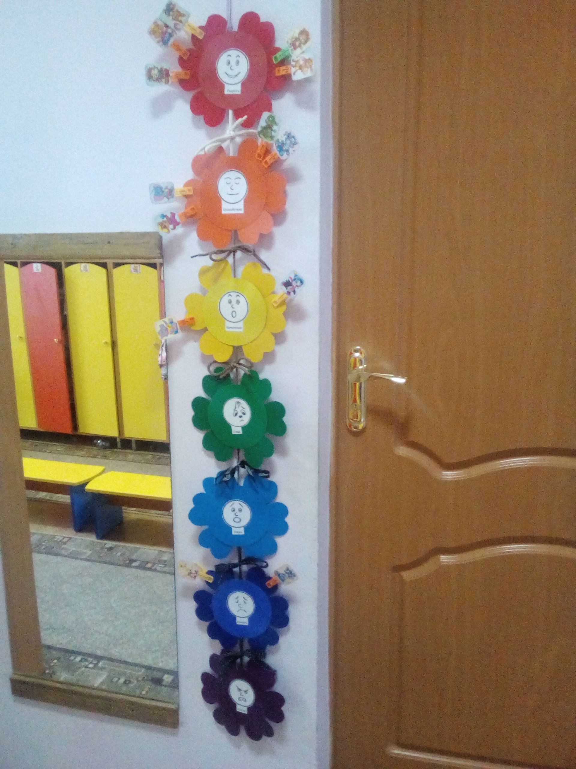 Детям вначале дня предлагается поведать остальным о своем настроении при помощи прищепки с картинкой со своего шкафчика. Рассказать о своих чувствах.