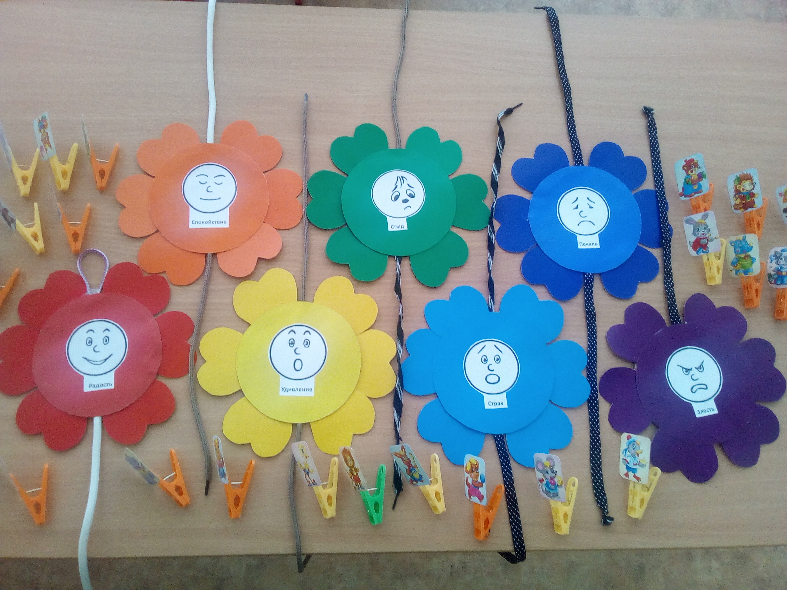 Из семи цветков, соответствующих цветам радуги. На каждом цветке с одной стороны лицо, выражающее эмоцию, на другой – цифры от 1 до 7.