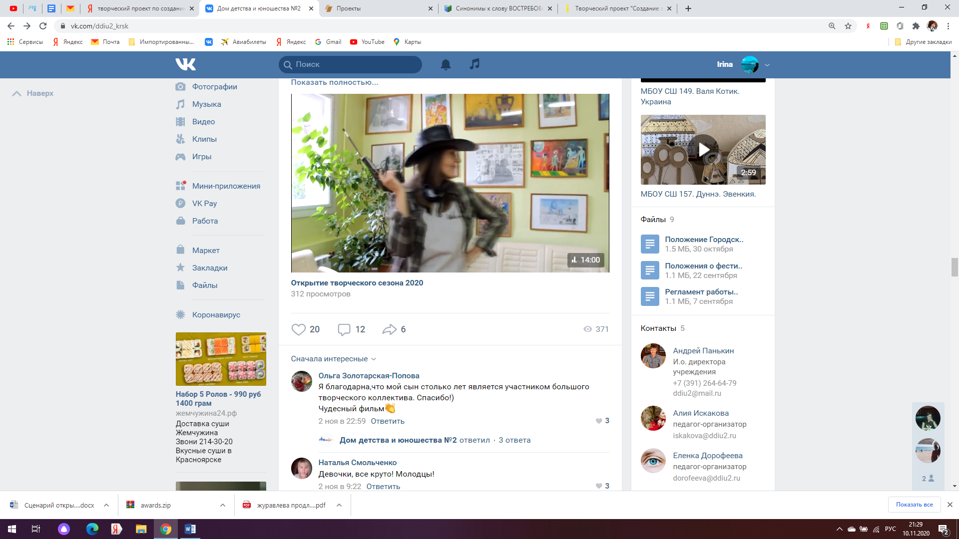 Съёмка видео материала о деятельности объединений. Монтаж видеофильма. Публикация в видеохостинге YouTube.