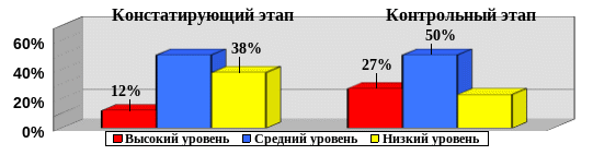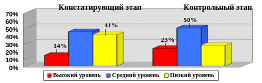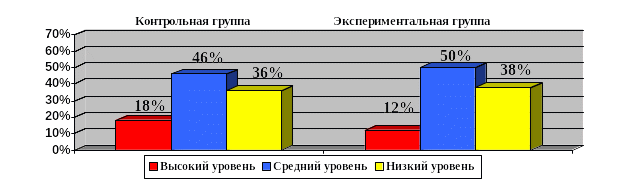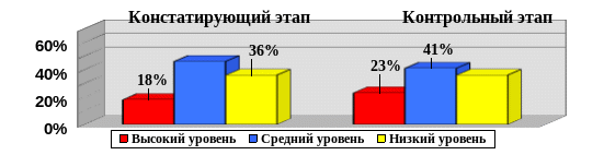 Анализ результатов исследования показал следующее: в контрольной группе на высоком уровне 5 учеников – (23%); на среднем уровне – 9 учеников (41%), на низком уровне 8 учеников - (36%).