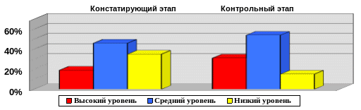 На основе результатов анкетирования на контрольном этапе эксперимента можно сделать вывод, что в контрольной группе высокий уровень сформированности коммуникативной компетенции уменьшился на 5%, средний уровень повысился на 9%, а низкий уровень уменьшился на 4%. В экспериментальной группе высокий уровень сформированности коммуникативнойкомпетенции повысился на 12%, средний уровень повысился на 8%, а низкий уровень уменьшился на 20%.