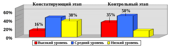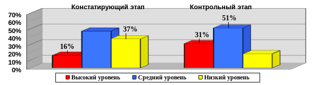 На основе результатов наблюдения на контрольном этапе эксперимента можно сделать вывод, что в контрольной группе высокий уровень сформированности ценностно – смысловой компетенции повысился на 9%, средний уровень повысился на 5%, низкий уровень понизился на 14%. В экспериментальной группе высокий уровень сформированности ценностно – смысловой компетенции повысился на 19%, средний уровень повысился на 4%, низкий уровень понизился на 23%.