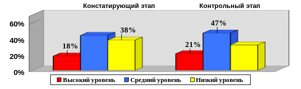 По результатам среднего показателя выявлено, что в контрольной группе высокий уровень сформированности ключевых компетенций повысился на 3%, средний уровень повысился на 3%, низкий уровень понизился на 6%. В экспериментальной группе высокий уровень сформированности ключевых компетенций повысился на 15%, средний уровень повысился на 4%, низкий уровень понизился на 19%.