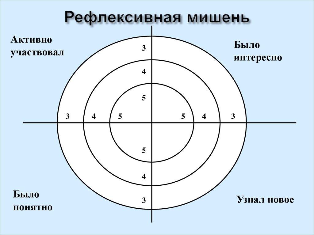 «Рефлексивная мишень» - каждому обучающемуся выдаётся картинка с изображением мишени, разделённая на 4 сектора: активно участвовал, было интересно, было понятно, узнал новое. Обучающиеся выбирают место на мишени.