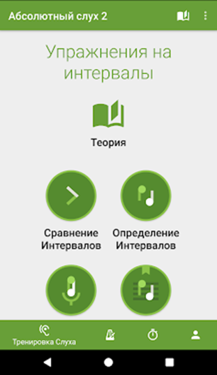 Мобильное приложение «Абсолютный слух». Для развития музыкального слуха, накопления слухового опыта, было создано мобильное приложение «Абсолютный слух». В данном приложении, ученик может научиться отличать лады, интервалы, определять ноты на слух и на нотном стане, развить чувство ритма. Так как мобильный есть у многих детей, ученики могут индивидуально развивать свои способности и исправлять пробелы в знаниях. А так же в приложении есть теоретический материал.