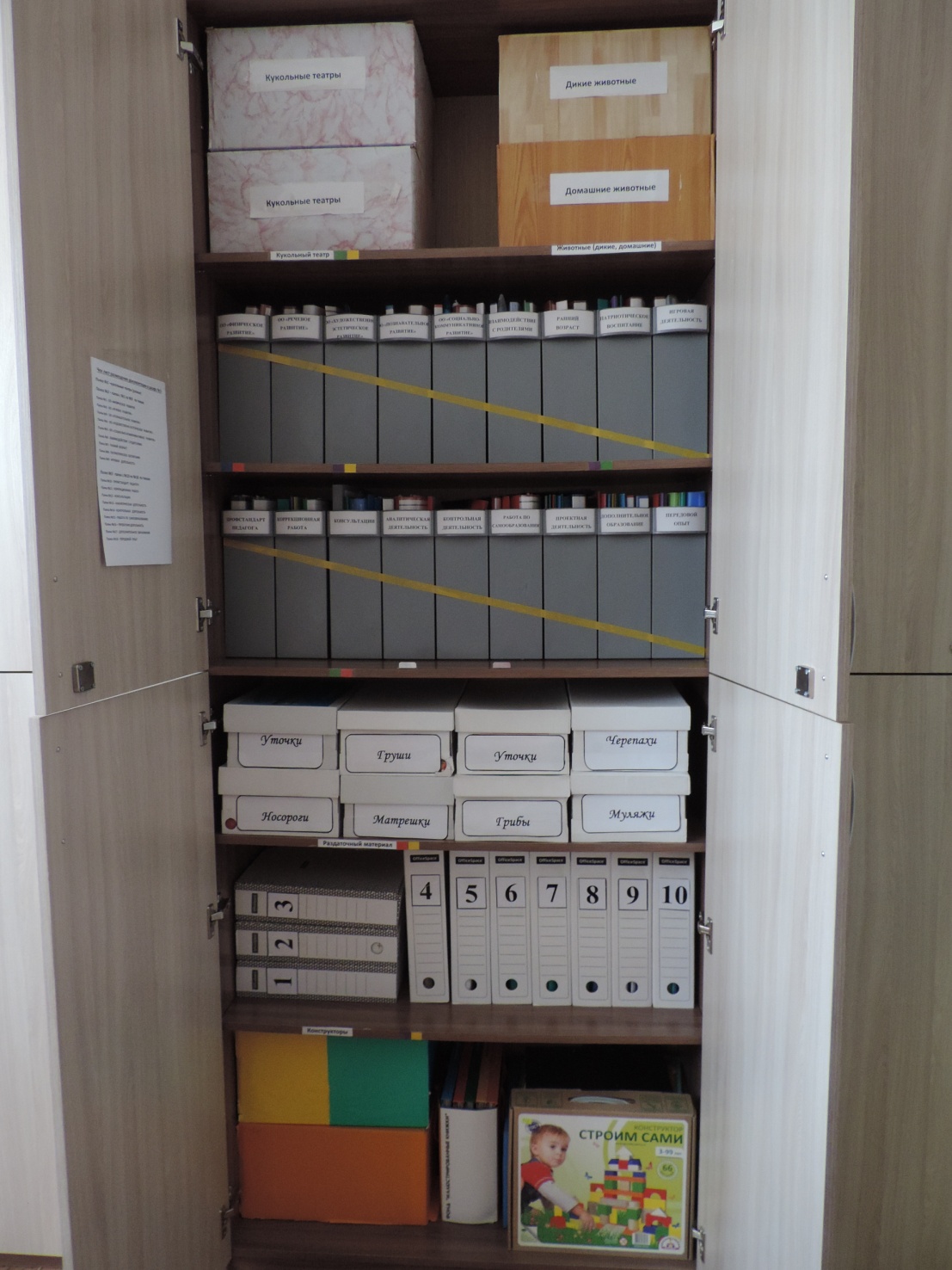 В шкафах полки пронумерованы и местонахождение материалов и пособий указано в чек – листе размещения пособий и документации, который прикреплен с внутренней стороны дверцы щкафа, что позволяет быстро найти необходимое.