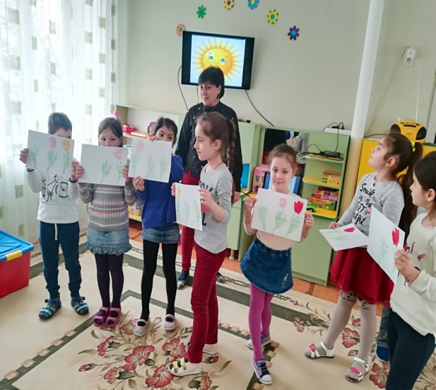 - Я рада, что вы сделали столько цветов для волшебной полянки. Ребята, смотрите, солнышко стало улыбаться! Оно опять дарит нам тепло.