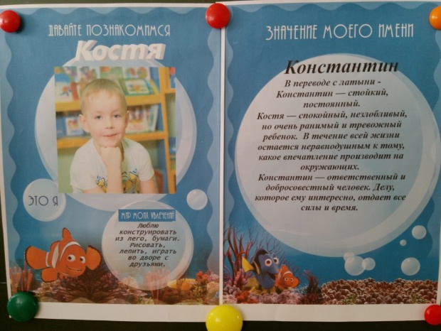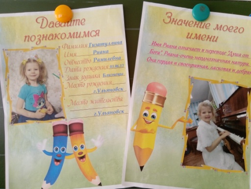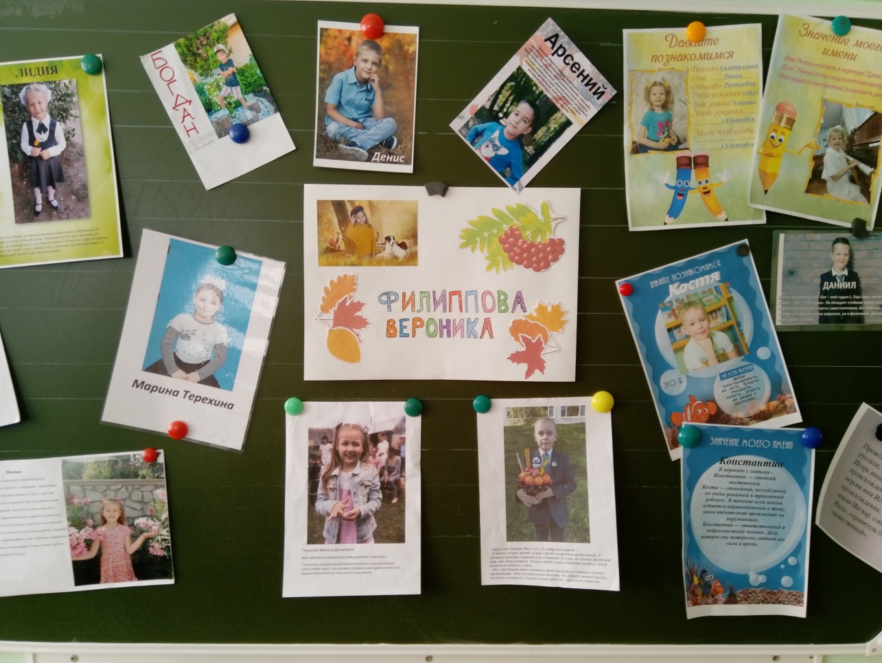 Первый этап: «Моё имя. Что означает моё имя? Почему меня так назвали?» Ребятам было дано задание: представить себя перед одноклассниками: сказать, как тебя зовут, рассказать, что означает твое имя и кто и почему тебя так назвал. Рассказ должен сопровождаться наглядным материалом, то есть, на листе бумаги наклеить свою фотографию, написать имя и все, что ты о нем узнаешь. А чтобы детям было понятнее, мы, учителя, решили сначала представить им себя. Мы выполнили все задания, которые задали нашим детям, а потом рассказали им о себе.