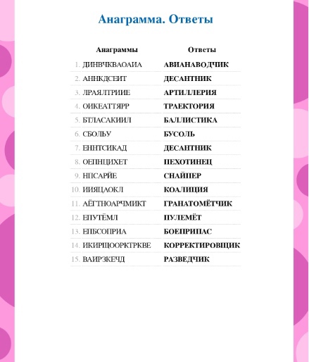 1 конкурс. Военная служба относится к тем видам деятельности, которые не только отличаются высокой социальной значимостью, но и особыми условиями, в которых они протекают. Усиливаются и требования к профессионально важным качествам солдат, сержантов, прапорщиков и мичманов. Поэтому первый наш конкурс будет на смекалку. (Приглашаются по одному участнику от каждой команды, за каждым из участников закреплён судья). По команде «Старт» на экране высвечивается заранее подготовленная анаграмма (приложение 1), задача участников за 60 секунд вписать ответы в заранее приготовленных бланках. Учитывается результат каждого участника. Места и распределяются в соответствии с результатами: за каждое правильно написанное слово - 1балл.
