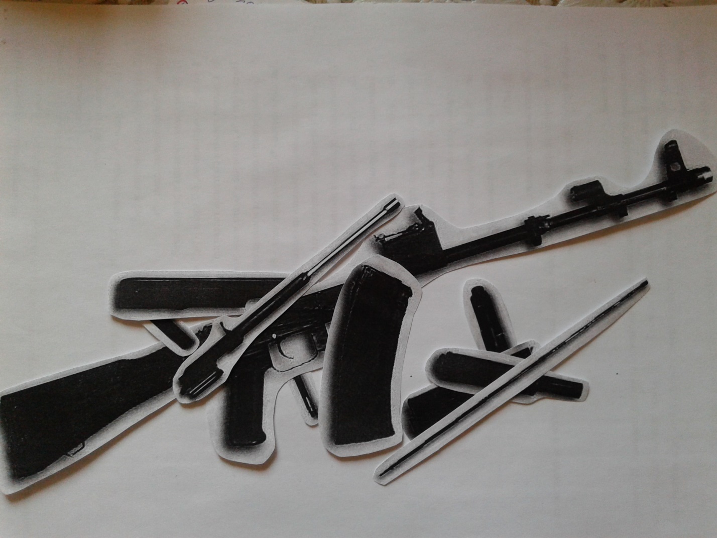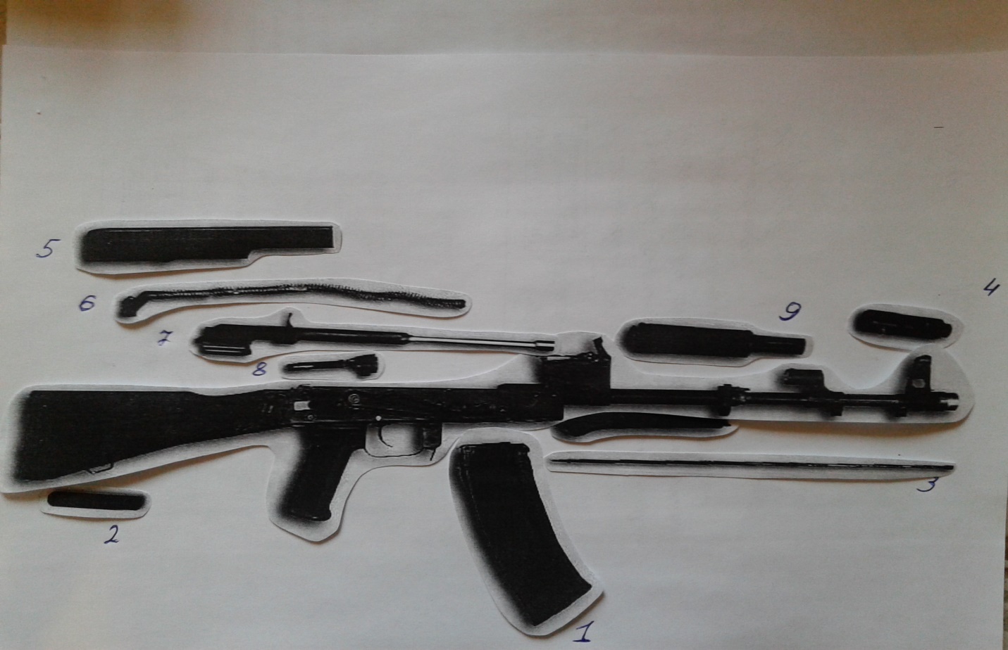Сборка и разборка автоматов на время. (Приглашаются по одному участнику от каждой команды, за каждым из участников закреплён судья). Для этого конкурса, на листе формата А4, в одинаковом масштабе, максимально приближенному к настоящему, предварительно были распечатаны и вырезаны по контуру детали автомата АК-74. На специальном листе-матрице (приложение 2) каждому участнику судья показывает и объясняет в каком порядке должны быть разобраны и собраны детали автомата, где и в каком порядке они должны находиться. Далее после объяснений, каждый судья перемешивает в хаотичном порядке детали (приложение 3) и ждёт команды ведущего. По команде ведущего