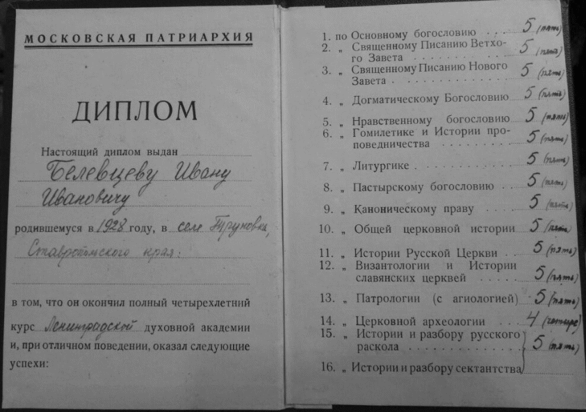 «Воспитанник 1-го выпуска Ставропольской Духовной Семинарии БЕЛЕВЦОВ (так в оригинале — Д. К.) Иван Иванович на протяжении четырех лет обучения при отличном поведении оказал прекрасные успехи по всем предметам семинарского курса. При неподдельной христианской настроенности неопусти-тельно посещал храм Божий, принимая участие как в чтении и пении на клиросе, так и в прислуживании в алтаре. Отмечая незаурядные умственные способности (выделено авт. — Д. К.) и доброе христианское настроение Белевцова, Правление Семинарии считает его вполне правомочным кандидатом для поступления в Духовную Академию».