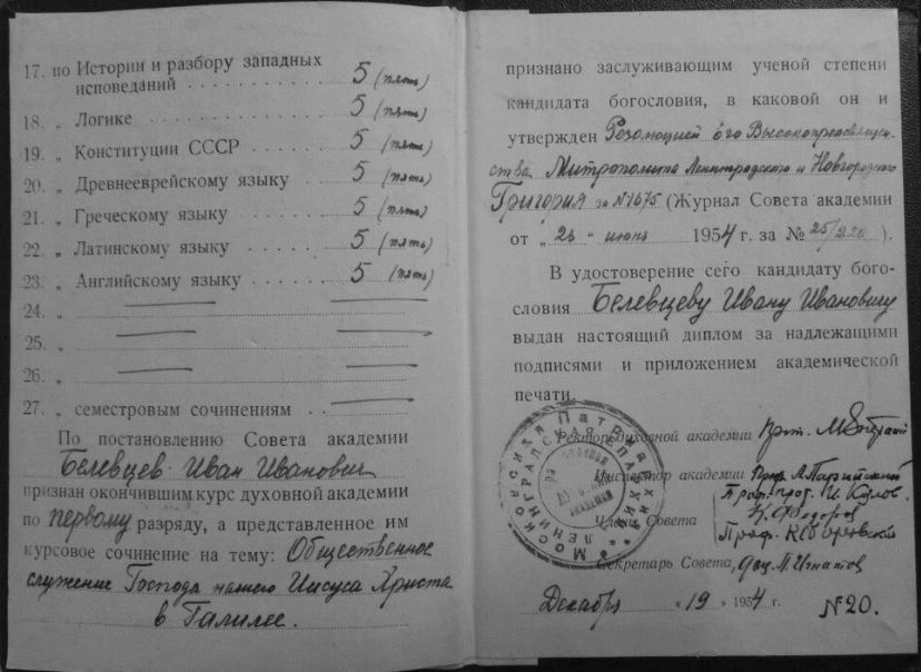 Академический диплом протоиерея Иоанна Белёвцева
