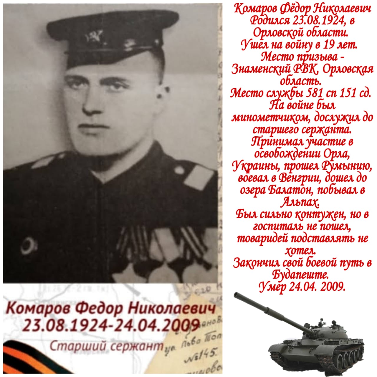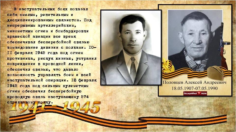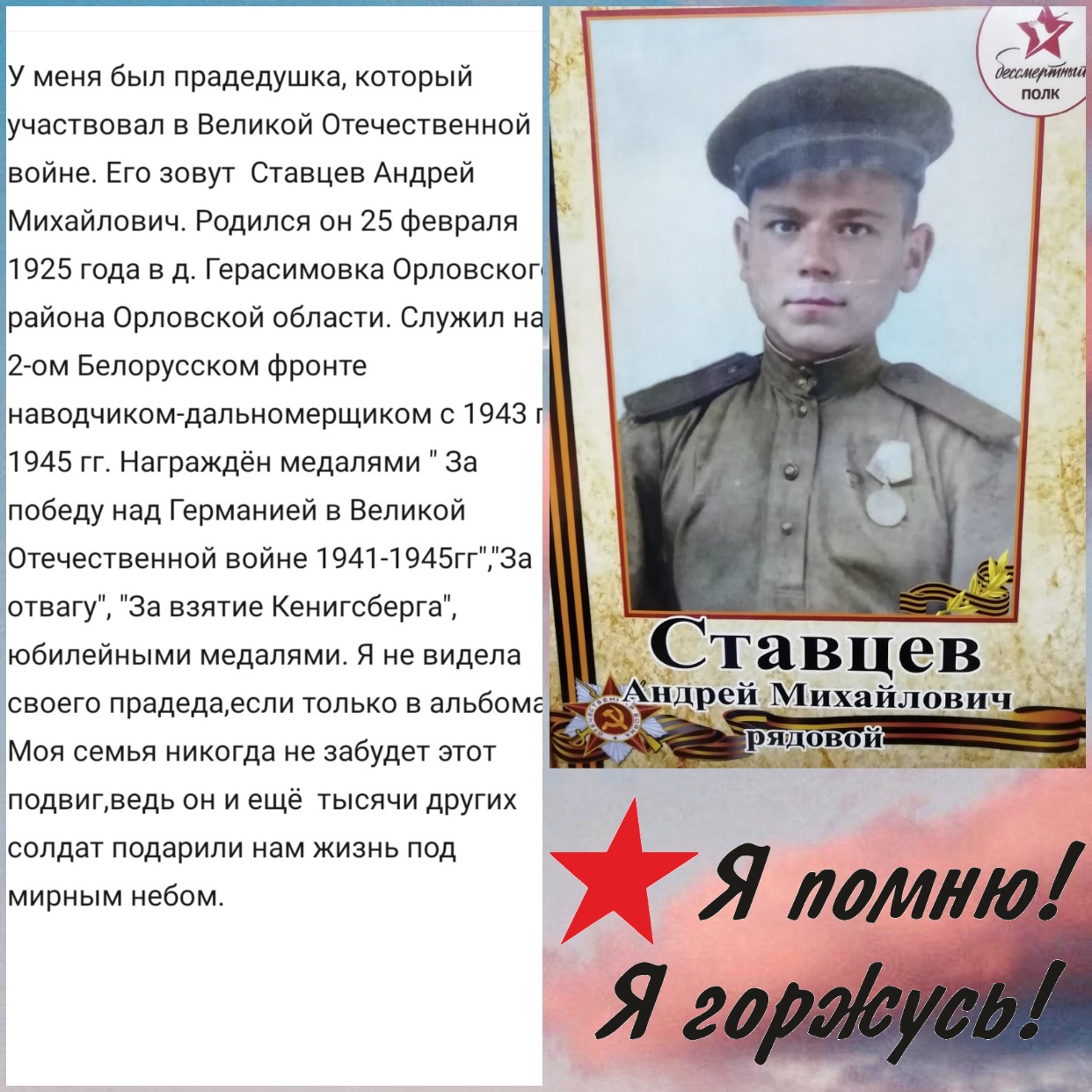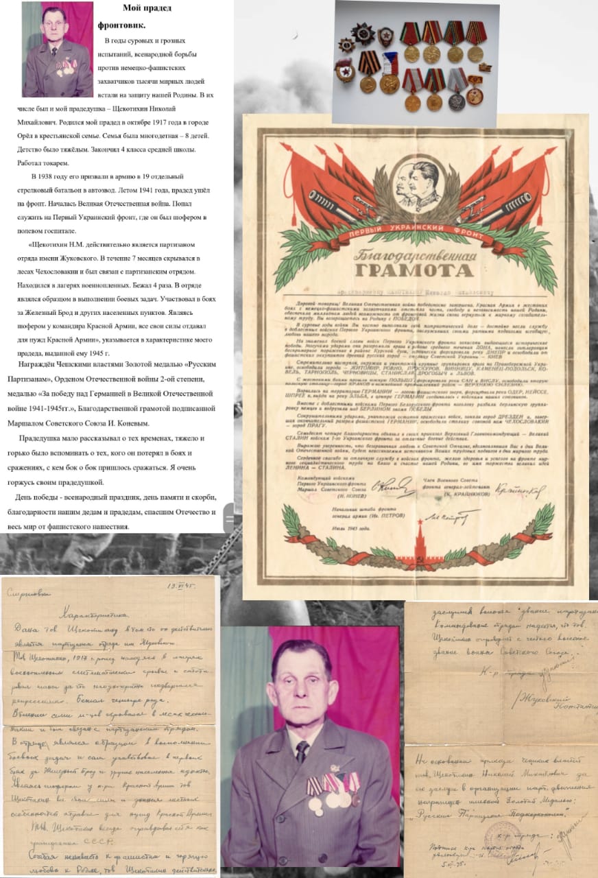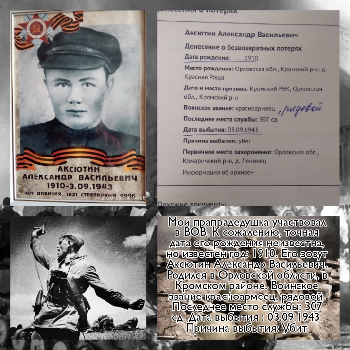 Следы той войны исчезают с лица Земли, но эхо её до сих пор не затихает в людских душах. В каждой семье есть своя история, связанная с ВОВ и каждая Российская семья чтит память своих родных, они, не жалея жизни, ковали победу над врагом ради нашего будущего. Подвиг каждого из них должен оставаться отпечатком в наших душах и сердцах. И наш долг - сохранить память об этом героическом подвиге! Ребята, Региональный центр «Созвездие Орла», предлагает вам принять участие в флешмобе «Мы помним! Мы гордимся!». Для принятия участия в флешмобе, необходимо оформить коллаж, используя любой доступный редактор, поместить фотографию вашего прадеда или других родственников, которые принимали участие в те страшные годы Великой Отечественной войны, и составить небольшой рассказ о его боевых подвигах и заслугах.