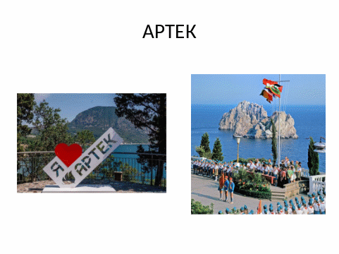— На побережье Чёрного моря, возле Медведь –горы находится детский оздоровительный центр « Артек», где отдыхают дети со всех уголков мира. Дети в Артеке отдыхают, плавают, загорают, танцуют, играют. А главное все дружат.