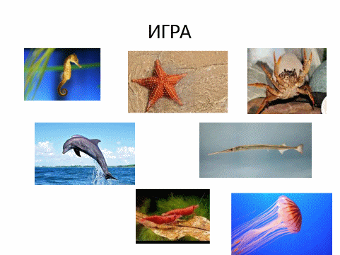 (краб , медуза , креветка , звезда , дельфин , мидия , скат , камбала , катран , конёк , рыба игла, ёрш)