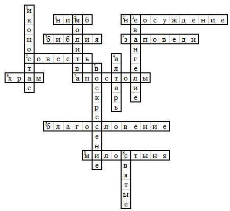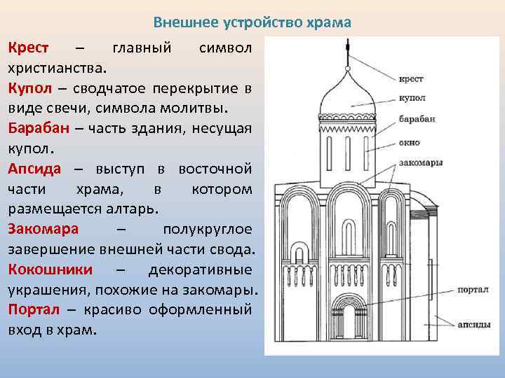 Оборудование и оформление: компьютер, проектор, экран, листы с кроссвордами для работы в группах), бланки для заполнения схемы внешнего устройства храма, листы с вопросами для первичного закрепления