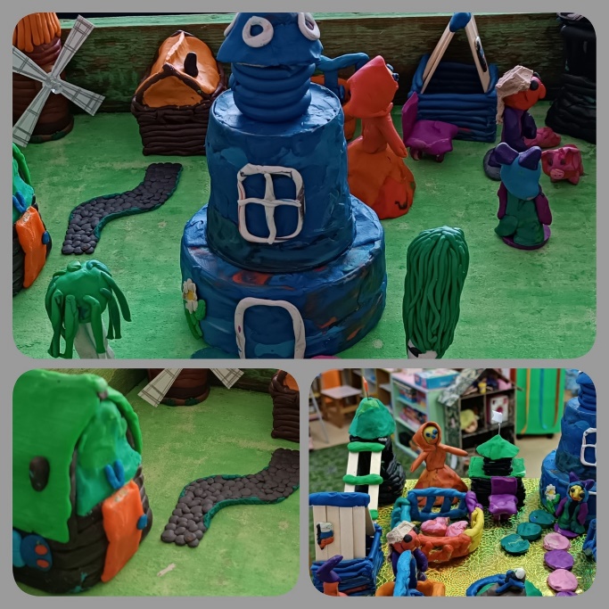Проектом месяца стало создание коллективного игрового города-макета «Пластилиновая Русь» (Рис. 1). Детям рассказали, как раньше жили люди и как защищали свой город, какие сооружения для этого делали. В городе создали церковь, деревянные избы, хлев с домашними животными, колодец, ров с водой, ограду с одним входом и мостом и т.д.