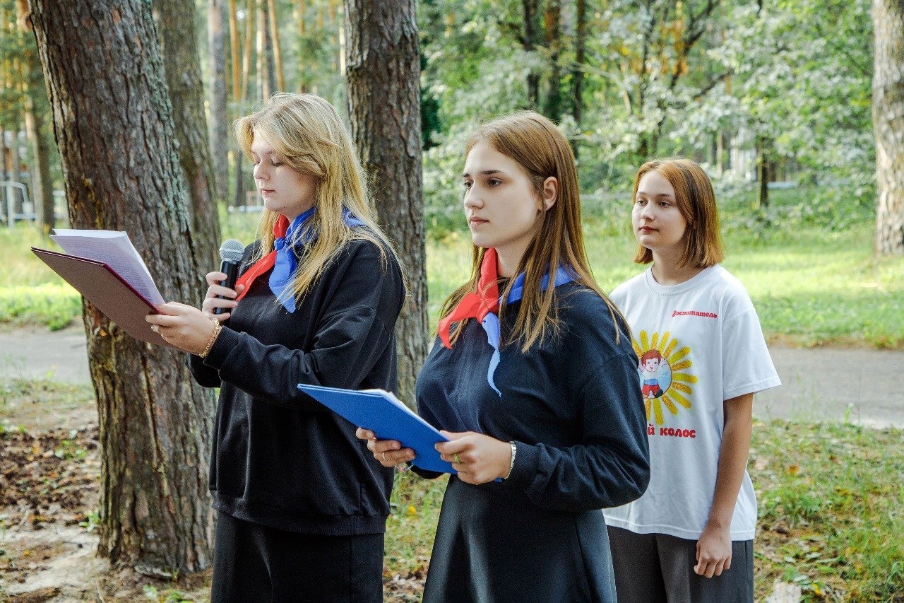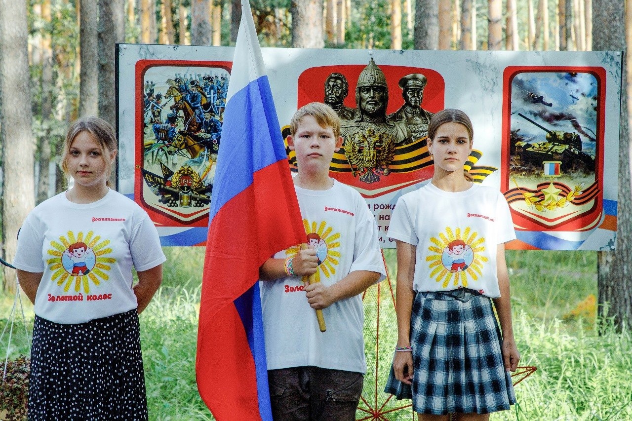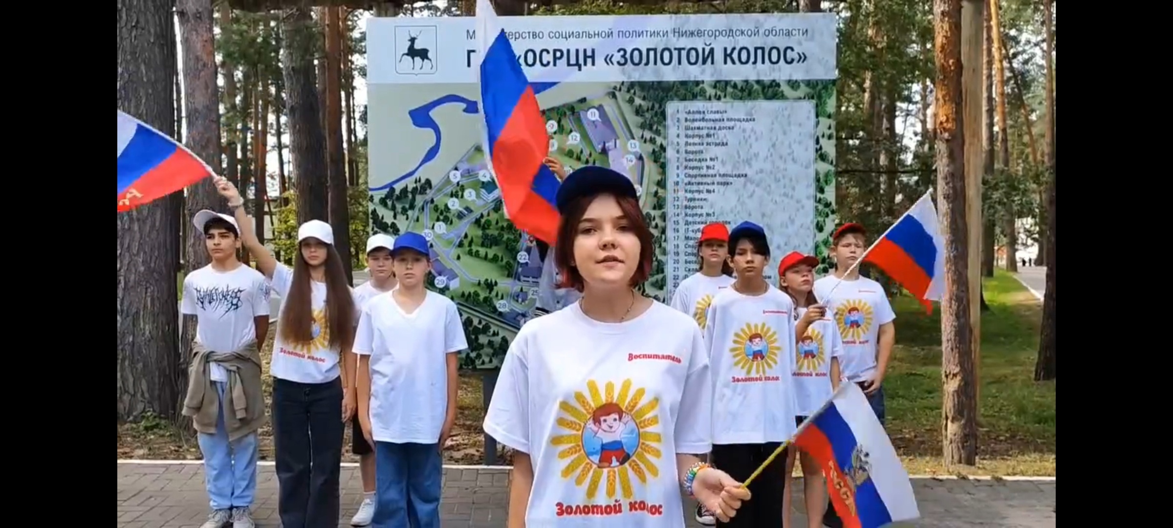 Ведущий 2: Лагерь, равняйсь, смирно! Приготовится к выносу Флага Российской Федерации. Флаг внести!